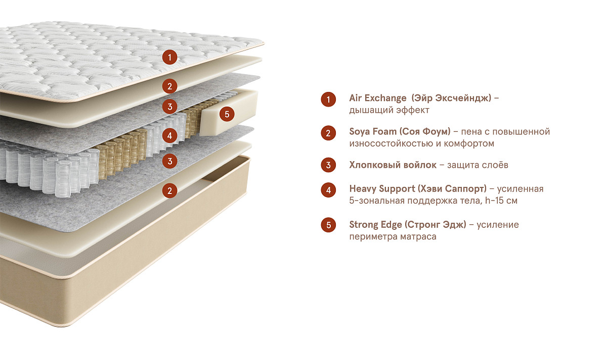 Матрас с дышащим эффектом, повышенными износостойкостью и комфортом. Усиленный 5-зональный блок индивидуально поддерживает каждую часть тела, благодаря чему снимается нагрузка с позвоночника, напряжение с мышц и суставов, создаются идеальные условия для комфортного отдыха и сна.