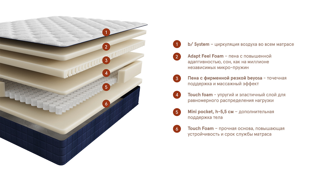 Комбинация пены с фирменной резкой beyosa и пружинного блока Mini Pocket обеспечивает мгновенный отклик на движения, ощущение невесомости и выверенную анатомическую поддержку.