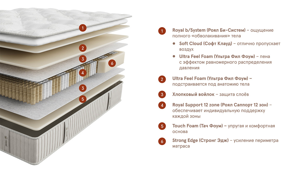 Матрас с системой роскошной комфортности Royal b/ System (Роял Би-Систем) дарит ощущение полного «обволакивания» тела, создавая идеальные условия для комфортного сна.